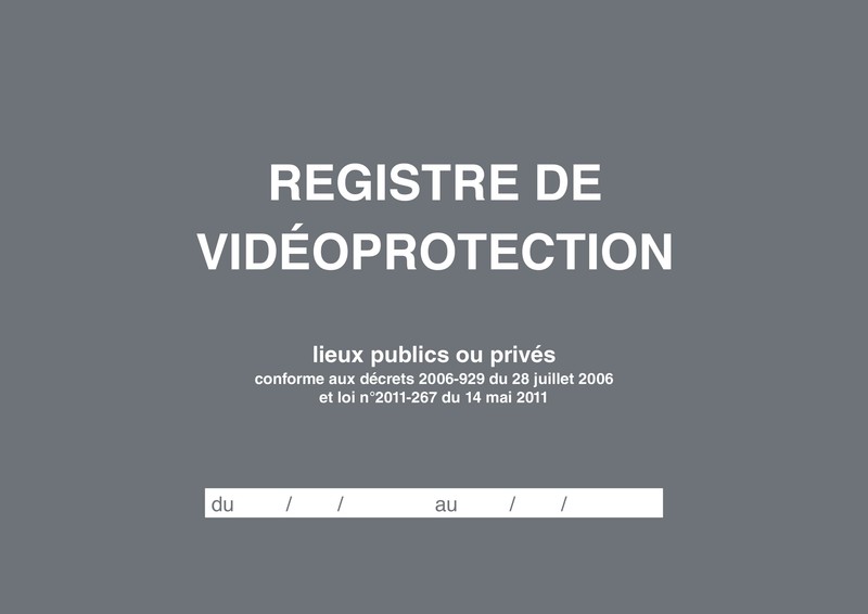 Le registre de vidéosurveillance permet le suivi des dates d'enregistrement et destructions des données (ou transmission au parquet). Conforme à la loi 95-73 du 21 janvier 1995, au décret 96-926 du 17 octobre 1996 relatif à la vidéosurveillance, au décret 2006-929 du 28 juillet 2006 et à la loi 2011-267 du 14 mars 2011.